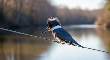 a wooden post near the waterfront, captured in a naturalistic style reminiscent of bird portraits by peter paul rubens and rogier van der weyden. the photograph showcases dark gray and red tones, taken with a canon af35m camera. the image features characterful animal portraits with sharp focus. ai generated