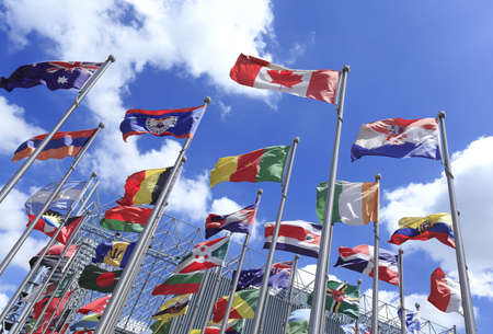 A sporting event, the flags of all countries fluttering in the wind on the standards. textile national country flag