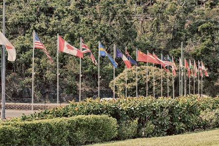 View of national flags of Southeast Asia countries; Myanmar / Burma, Malaysia, Laos, Indonesia, Cambodia, Brunei Darussalam.