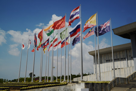 ASEAN member country flags waving on tall poles under bright sunlight blue sky. Southeast Asian unity. International relations and diplomacy.