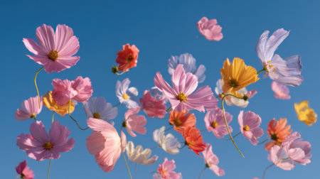 Bright flowers flutter gently in the breeze under a clear blue sky showing natures beauty.