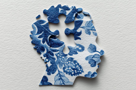 An artistic silhouette of a human head features a striking blue and white floral design. The composition reveals a puzzle-like element within, suggesting mental processes. The image displays a close-up view with bright, even lighting, creating a clean aesthetic. This graphic may be suitable for educational, conceptual, or design projects.