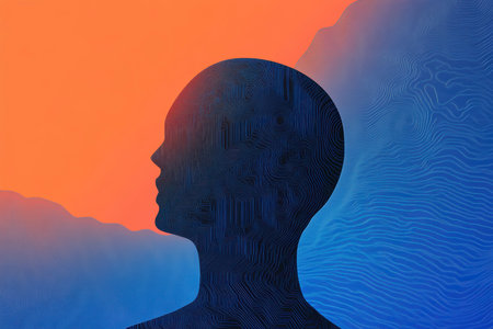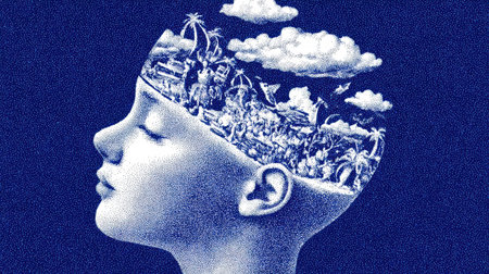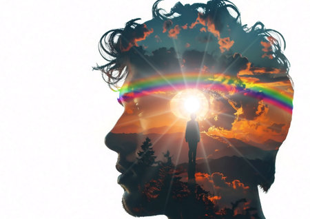 An artistic representation of a human profile featuring vibrant colors and symbolic elements. Inside the head, a wave, sun, and a representation of a brain are visible. The composition uses bright colors and textures against a dark background, suggesting a concept relating to thought, creativity, and the mind. It is suitable for various commercial uses.