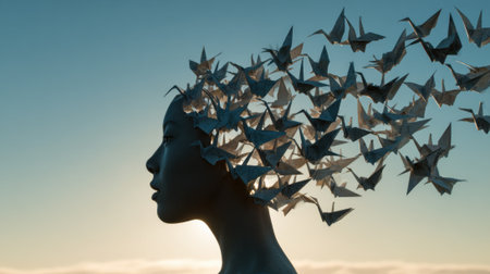 A graceful silhouette of a woman features an intricate blend of origami cranes rising from her head. The serene sunset casts warm hues behind her, creating a dreamlike atmosphere.