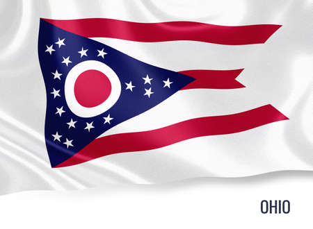 U.S. state Ohio flag waving isolated on white. State name included below the artwork.