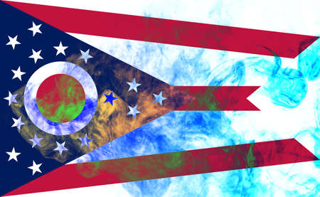 The national flag of the US state Ohio in against a gray smoke on the day of independence in different colors of blue red and yellow. Political and religious disputes, customs and delivery.