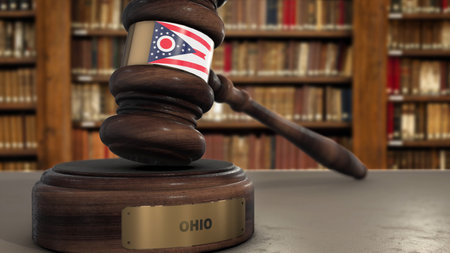 Ohio Flag on Judge Gavel or Hammer in Court with State Name. Legal System 3D Illustration.