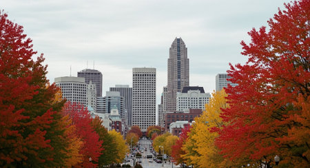 Aerial view of downtown Charlotte, North Carolina during fall season.