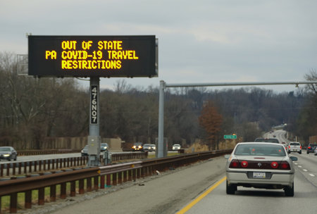Media, Pennsylvania, U.S.A - November 25, 2020 - The digital sign on the interstate reminding out of state drivers of Covid-19 travel restrictions