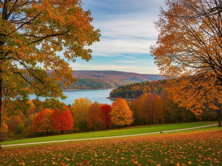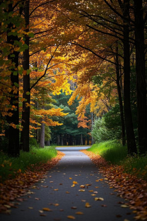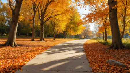 A peaceful pathway means through a park, bordered by trees adorned with brilliant autumn foliage. Golden leaves blanket the ground, creating a picturesque fall atmosphere.