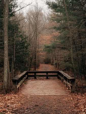 Wooden walkway in the forest with trees and fallen leaves.