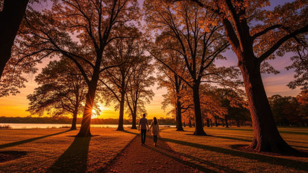 Two people walk hand-in-hand along a pathway as the sun sets. The image showcases tall trees and a colorful sky featuring orange and purple hues. The composition includes long shadows and suggests an outdoor environment. This image could be suitable for a variety of editorial or commercial purposes.