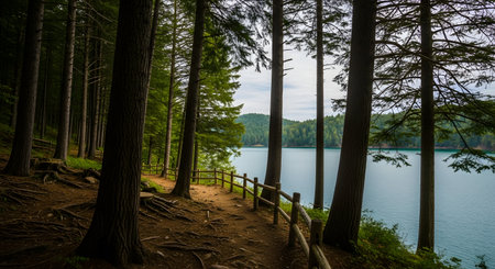 A winding dirt path through a dense forest leads to a calm lake, bordered by a wooden fence.