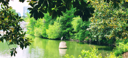 Green trees and pond in the city park. Green nature background.