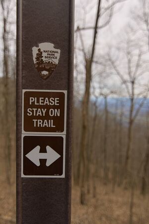 A trail marker in Cumberland Gap National Historic Park telling hikers to stay on the trail with arrows showing where it is. Background is blurred out.