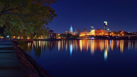 The historic skyline is illuminated at night, with vibrant lights reflecting on the calm waters. Trees line the waterfront, adding to the urban peaceful ambiance.