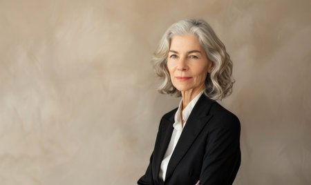 Corporate portrait of a senior businesswoman in a tailored black suit against a soft cream backdrop