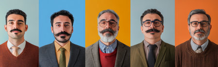 Collage of men with different mustaches posing against color backgrounds, AI Generated