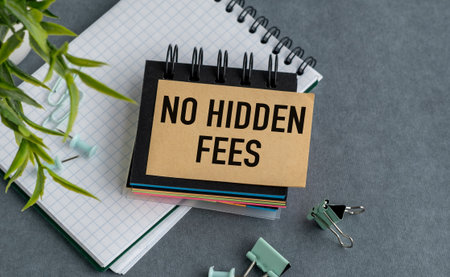 A notebook with a sign that says No Hidden Fees on top of it. The notebook is on a table with a pair of scissors and a pair of tweezers