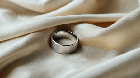 A beautiful close-up of a silver wedding band resting on soft cream fabric, perfect for wedding, anniversary, or engagement themes. Elegant and timeless.