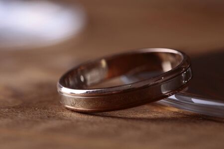 Golden wedding ring on wooded background close-up