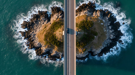Aerial view of the road and island in the sea. Drone photography.