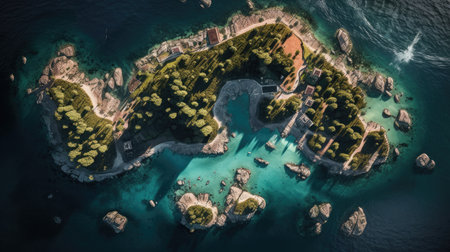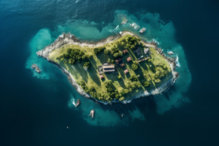 An aerial view of a small island in the middle of the ocean. AI generative image.