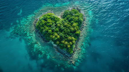Heart shaped tropical island in the middle of a clear blue ocean. a celebration of the feast of Saint Valentine. Massive tropical island with a heart shape in the water, as seen from above. All that i. Generative AI
