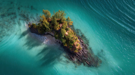 Aerial view of a small tropical island surrounded by turquoise water, secluded and serene