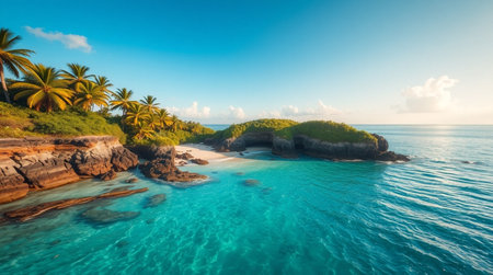 A tropical island surrounded by turquoise waters and palm trees
