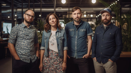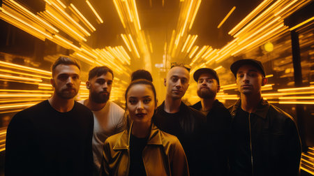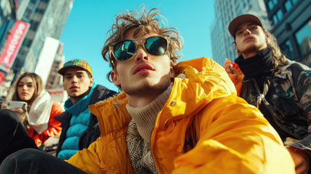 A vibrant portrait capturing youthful energy and diversity, featuring four friends with unique styles against a colorful urban backdrop. Generated AI brings this scene to life with a modern touch
