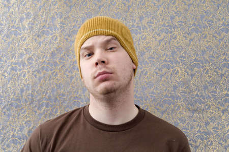 Portrait of a guy with colorful neon light on blue studio background. Male model with calm and serious mood. Facial expression, cyberpunk, millenials lifestyle and look like. Future, technologies.