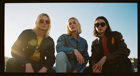 Group of young people, men and women in trendy outfits, inspired by 90s fashion, vibrant windbreakers and casual jeans.