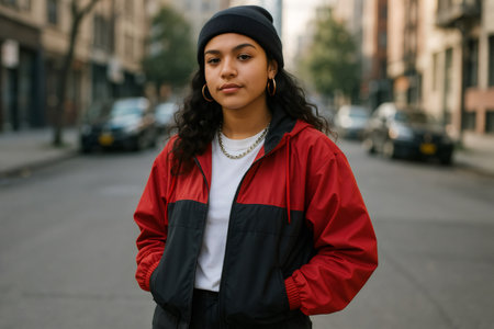 Portrait of a cool young woman confidently posing in an urban street of New York City, showcasing her trendy style and casual fashion