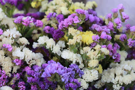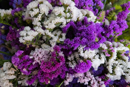 Bouquets of white and purple statice flowers at the market close up. Beautiful floral background. Top view.Selective focus