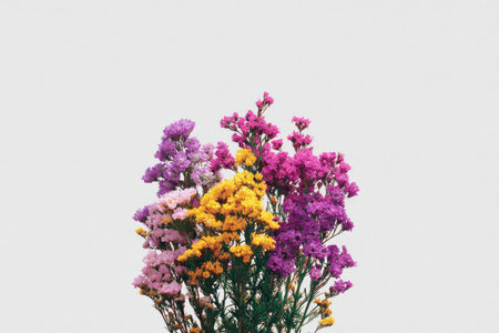 Multicolored dried flowers, colorful limonium statice plant with copy space, blank white paper with place for text