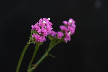 Beautiful pink flowers of Statice latifolia on a dark background. Close-up. Selective focus.