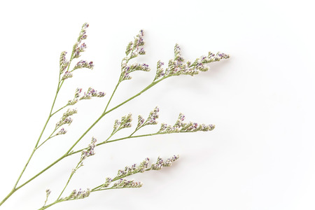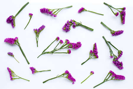 Kermek on white. The statice plant for bouquets and dried flowers. Background with copy space.