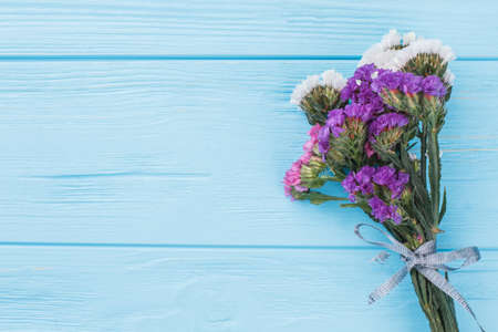 Bouquet of limonium statice flowers on wood and copyspace. Top view. Blue wooden table background.