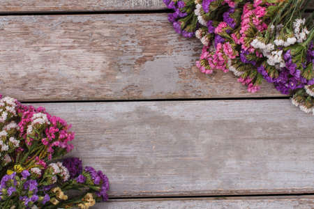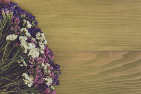 Colorful statice flowers and free space for text. Wooden desk background.
