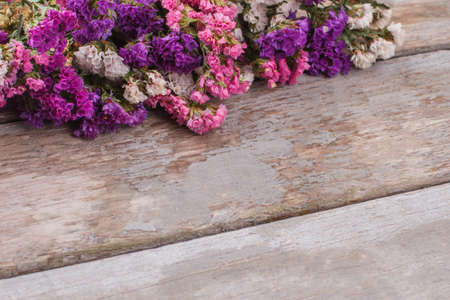 statice purple flower on wooden floor, Place for text.