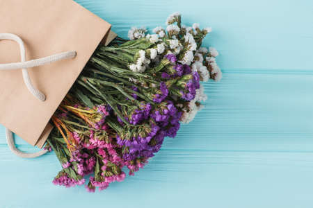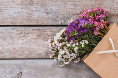 Colorful statice limonium flowers in paper bag. Old wooden table. Close up.