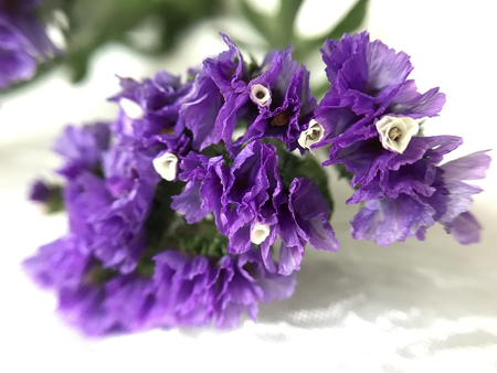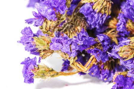 Macro abstract texture view of dried purple statice (limonium) blossoms on white background