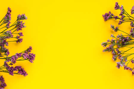Summer Dried Flowers on Yellow Background. Minimalist flat lay background for mock-up template.