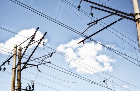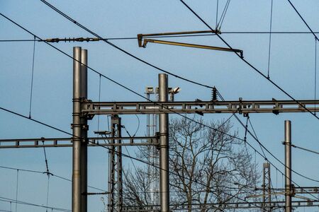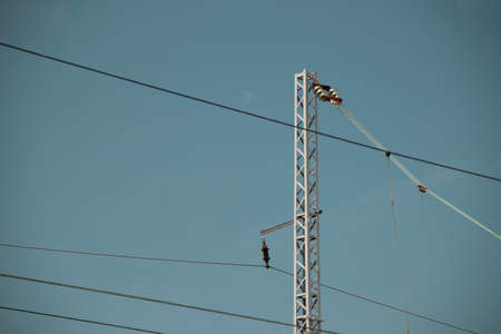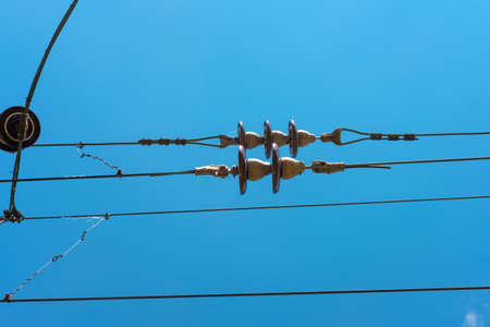 High voltage electrical conduction cables. Cables that supply energy to the electric train while it circulates on the track. Madrid, Spain.