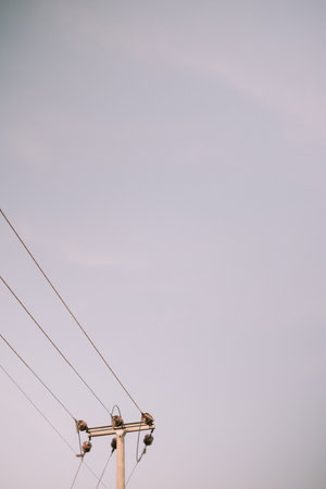 Power electric pole with line wire on colored background close up, photography consisting of power electric pole with line wire under sky, line wire in power electric pole for residential buildings