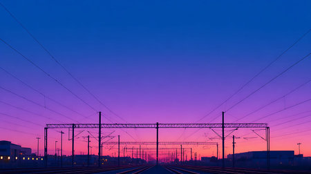 Silhouette row of electric poles with cable lines against colorful twilight sky background, low angle view with copy space
