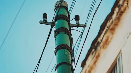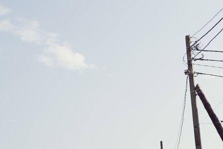 Photo of a concrete pillar with electric wires and sky on a sunny day with copy space