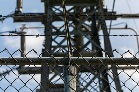 close up on Modern metal fence with barbed wire on the top, high-voltage electrical substation Elements in the background