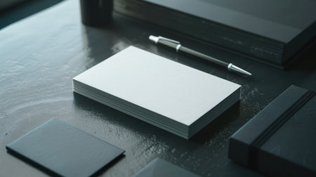 A flat lay of business cards and a pen on a modern desk, leaving plenty of space for copy.